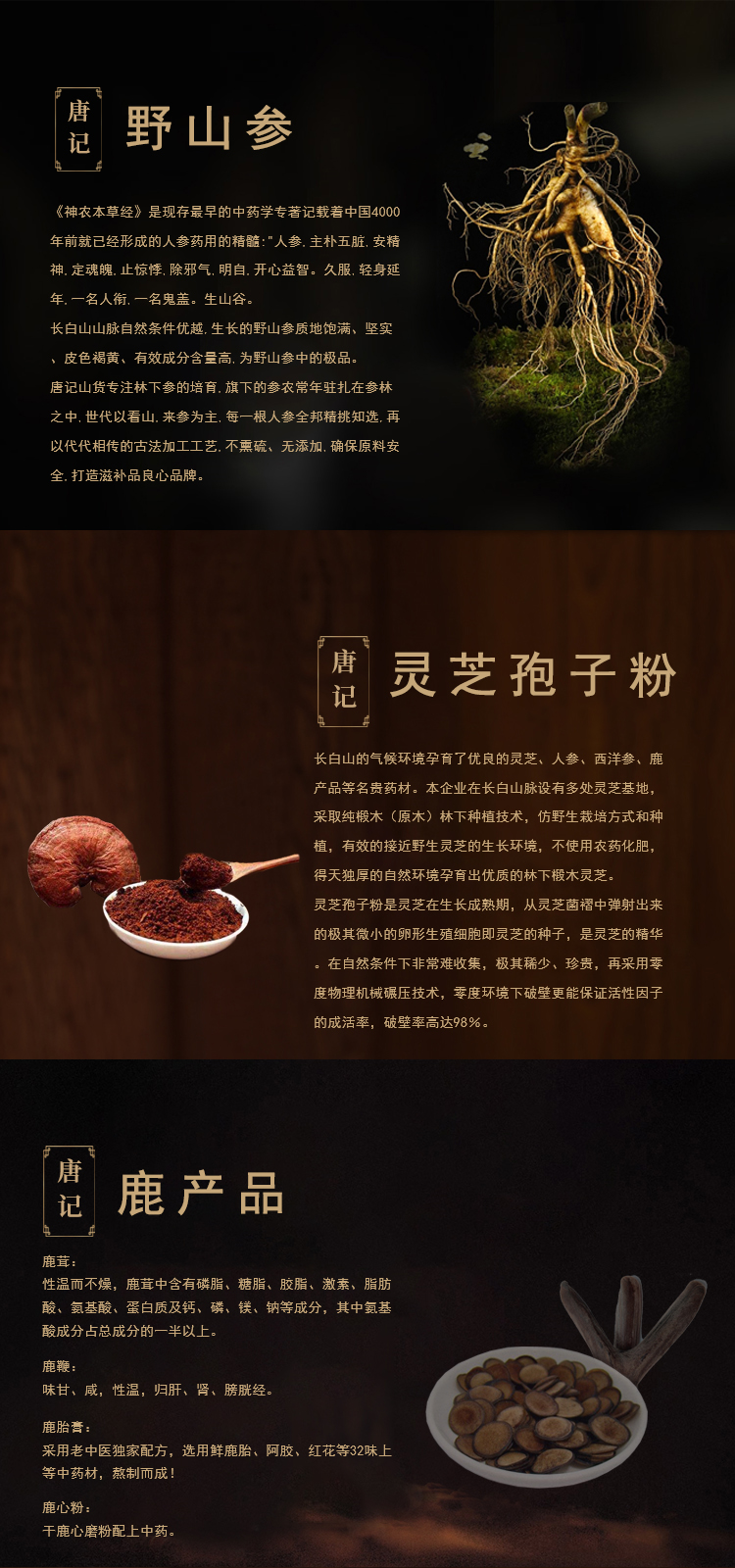 《神農(nóng)本草經(jīng)》是現(xiàn)存最早的中藥學專著記載著中國4000年前就已經(jīng)形成的人參藥用的精髓:"人參,主補五臟,安精神,定魂魄,止驚悸,除邪氣,明自,開心益智。久服,輕身延年,一名人銜,一名鬼蓋。生山谷。 長白山山脈自然條件優(yōu)越,生長的野山參質(zhì)地飽滿、堅實、皮色褐黃、有效成分含量高,為野山參中的極品。